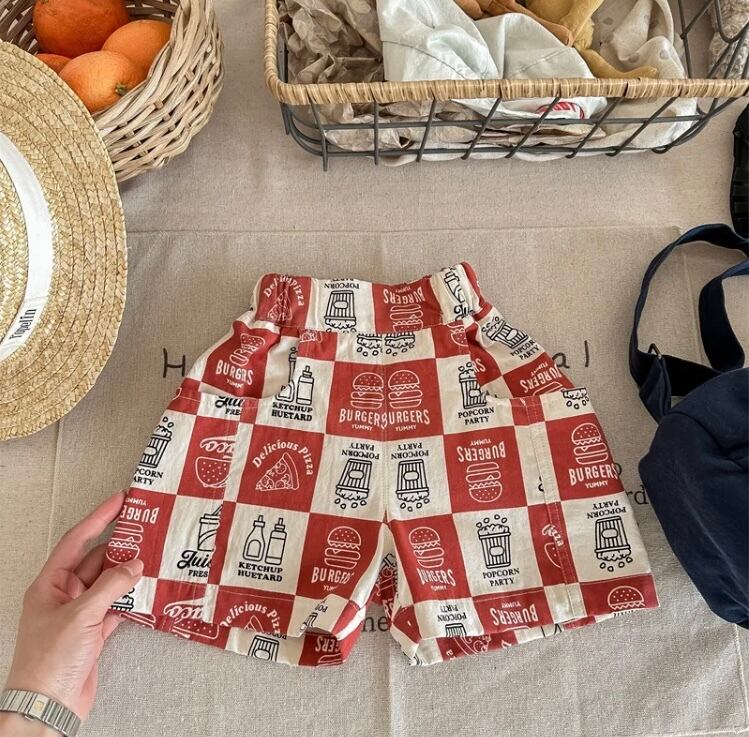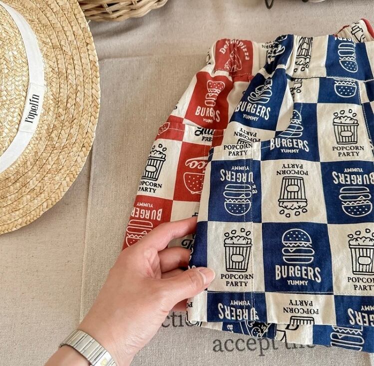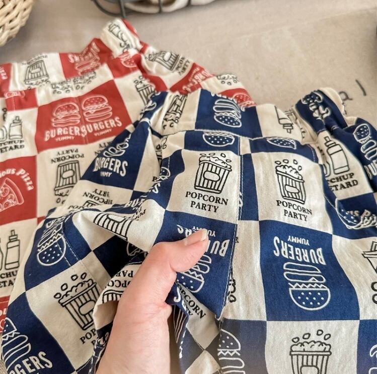 可愛いハンバーガーやポップコーンのイラストとチェッカー柄が目を引くキッズパンツです‼︎